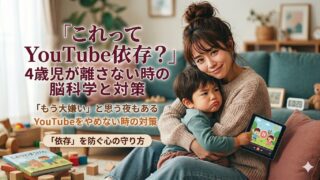 4歳のYouTube癇癪に悩んでいませんか?「やめなさい!」と怒鳴らなくて済む、YouTube Kidsのタイマー設定や脳科学から見た「子供がやめられない理由」を解説。おすすめ優良チャンネルも紹介します。自己嫌悪で涙が止まらないママの心が、少しだけラクになる「栞」を綴ります。